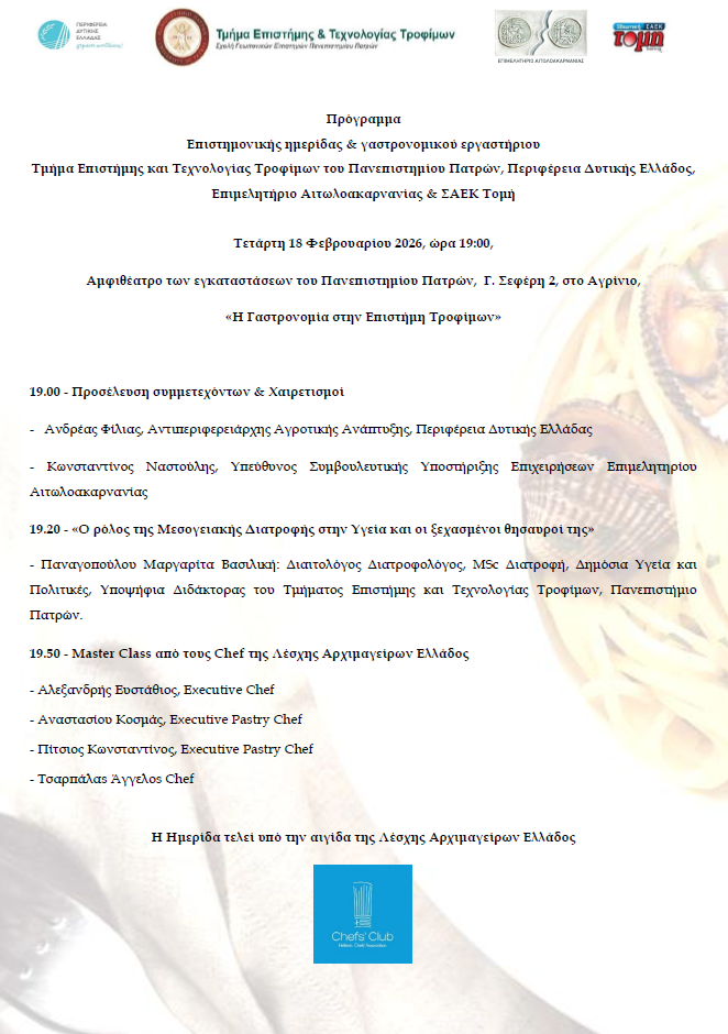 Το Τμήμα Επιστήμης και Τεχνολογίας Τροφίμων του Πανεπιστημίου Πατρών σε συνεργασία με την Περιφέρεια Δυτικής Ελλάδος, το Επιμελητήριο Αιτωλοακαρνανίας και την ΣΑΕΚ Τομή,