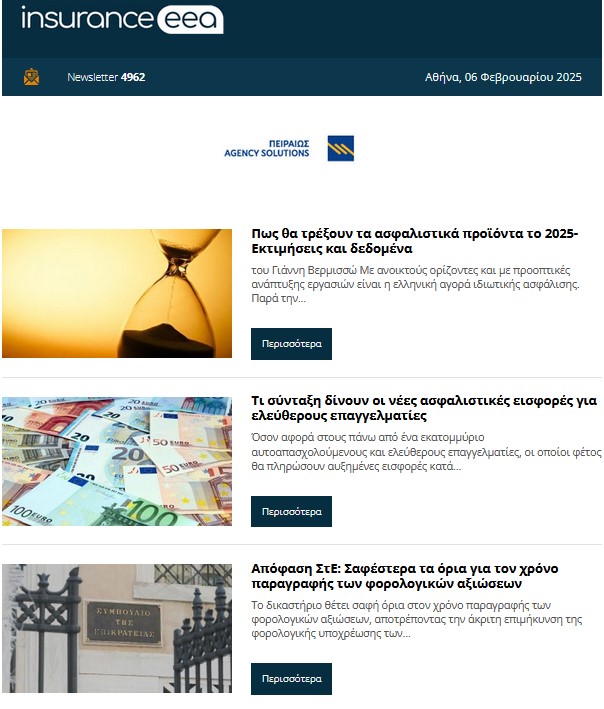 6 Φεβρουαρίου, 2025 - In Γενική Πληροφόρηση By Lampros Lois Comment off Πως θα τρέξουν τα ασφαλιστικά προϊόντα το 2025- Εκτιμήσεις και δεδομένα Ενημερωθείτε για τα τελευταία νέα της insurance eea πατώντας επάνω στην εικόνα. Previous Ενημερωτικό δελτίο οικονομικών & επιχειρηματικών ειδήσεων από την Αίγυπτο- Ιανουάριος 2025 Next 6 νέα μέτρα για τη μείωση του ιδιωτικού χρέους – Διπλασιάζεται το όριο στον υποχρεωτικό εξωδικαστικό μηχανισμό
